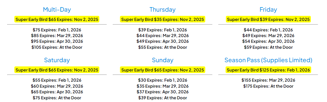 This year, getting your badge is easier than ever, no promo codes needed! Instead of hunting for discounts, we’ve built them right into the registration system. As we get closer to the event (or as allotments sell out), badge prices will increase in set tiers. The earlier you register, the more you’ll save, but once a tier sells out or expires, the next price level will automatically take effect. Check the chart below for a full breakdown of badge types, pricing, and deadlines.