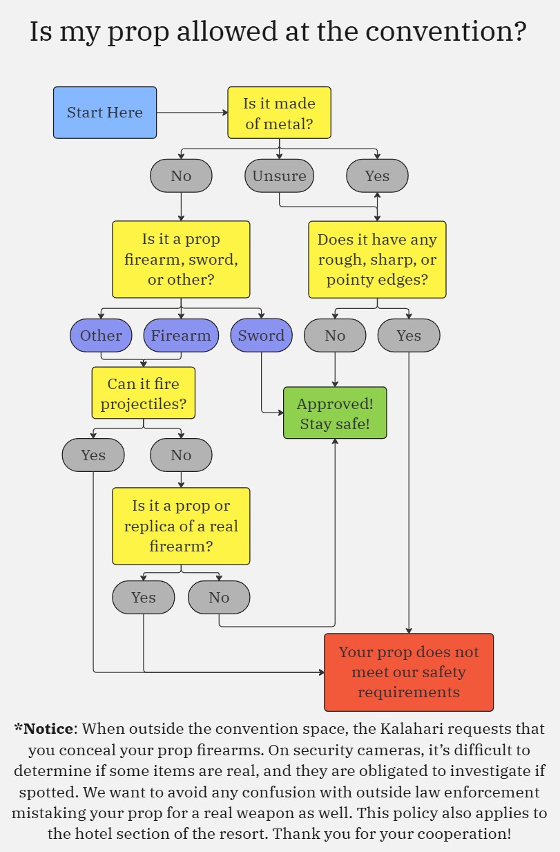1. We want all our attendees to have an amazing time in an open-minded and welcoming environment where everyone can enjoy everything our event has to offer. However, to ensure a safe and enjoyable experience for all, we have to put some restrictions on props and other items.